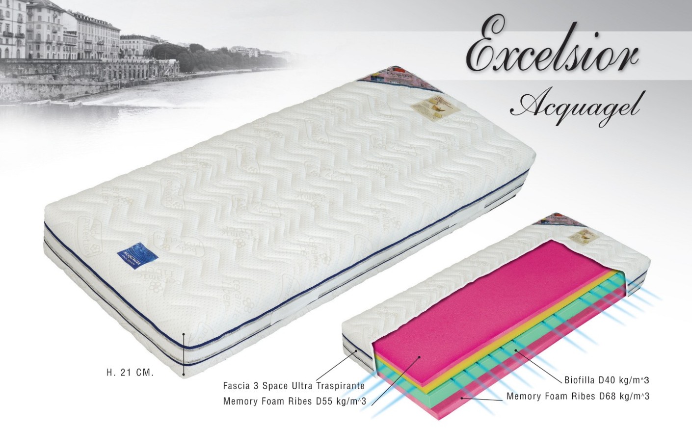 Il materasso Excelsior Acquagel è disponibile in tutte le misure, singole, matrimoniale e fuori misura. Il materasso è alto 21cm ed è adatto a supporti ergonomici meccanizzati.