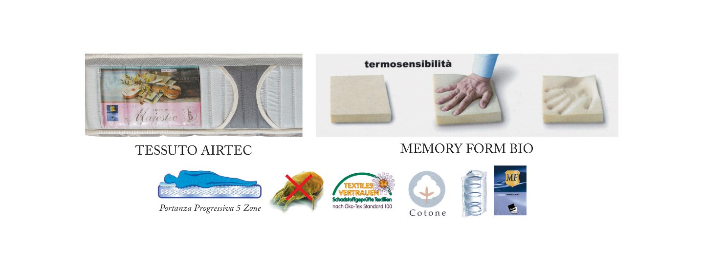L’asse portante dell’organismo, la colonna vertebrale, subisce durante i movimenti, colpi, vibrazioni e stress. Sono in particolare i dischi intervertebrali, quelli che la rendono flessibile ed elastica, a farne le spese. La compressione dei vasi sanguigni periferici, arteriosi e venosi, durante il sonno, provoca ipossia (scarso afflusso di sangue); da qui quei fastidi, come formicolio o crampi agli arti che contribuiscono a far cambiare posizione rovinando così l’intensità del sonno. Il materasso artigianale Majestic è stato progettato per contrastare questi disturbi. La struttura portante è costituita da un molleggio a 5 zone di portanza differenziata. La parte elastica, strutturata a box, è composta da strati sovrapposti di uno schiumato in fibra vegetale a polimeri hi-tech (Biofilla) da ben 40 mm di spessore per lato. Da un lato è presente uno strato di Memory Foam Ribes da 30mm a 7 zone di portanza differenziata, arricchito dall’essenza del Ribes (Ribes Rubrum), bacca da sempre impiegata come lenitivo dei dolori reumatici, soprattutto a livello delle articolazioni, in grado di limitare gli effetti delle allergie stagionali. L’insieme di queste caratteristiche permettono al corpo di assumere la posizione più ergonomica possibile. Lo speciale rivestimento non sfoderabile di questo materasso è in purissimo cotone doppio ritorto con Argento a disegni jacquard quadri, lavorato con motivi di contrasto, unito ad imbottiture in pura lana sul lato invernale e fresco cotone sulla parte estiva più rigida. Sulla fascia perimetrale è presente, in corrispondenza dello strato in Memory, una speciale maglia Super – Fresh traspirante cha garantisce un’ottima aerazione del lato Memory.