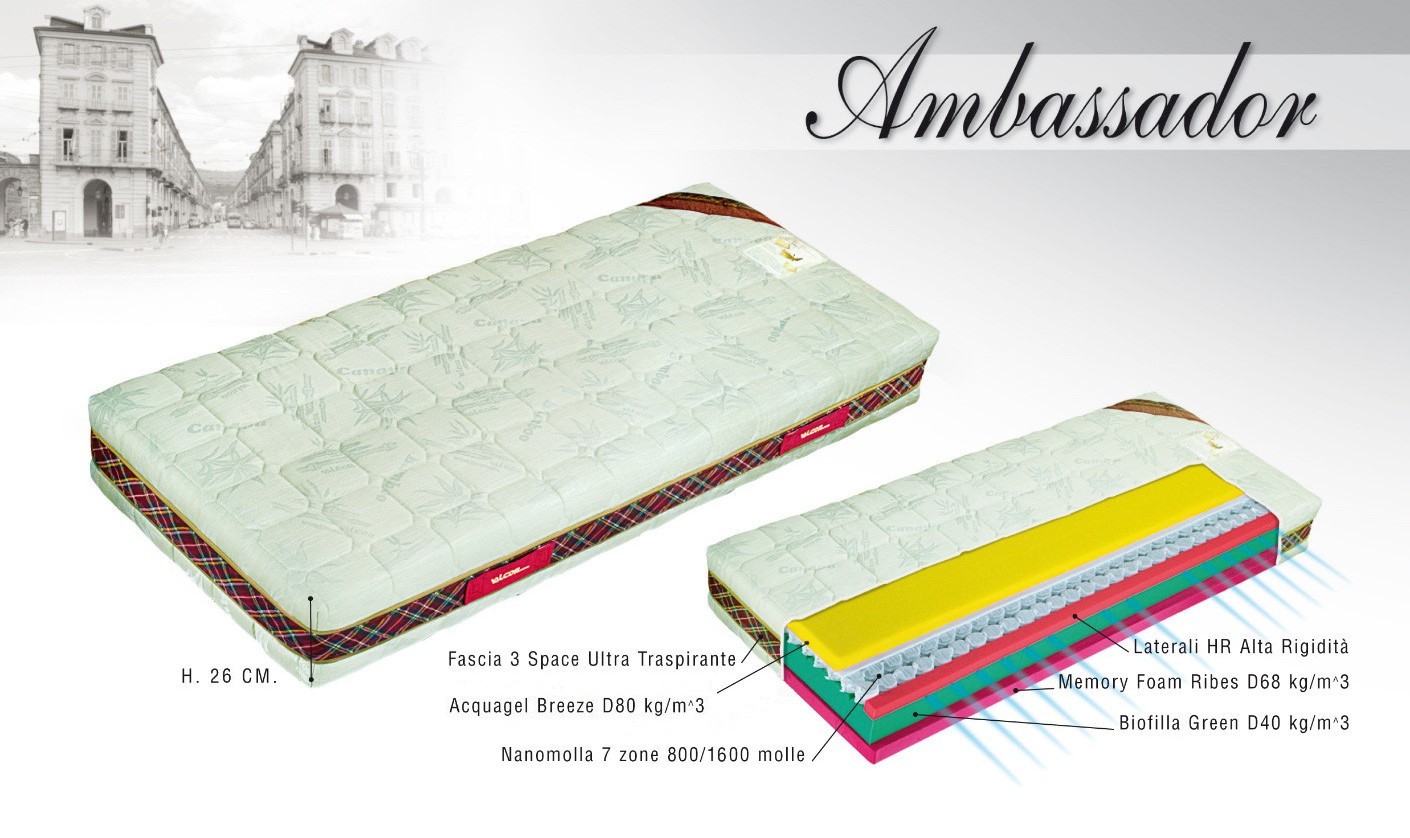 Il materasso Ambassador è tra i più evoluti della Valcor. L’anima interna è costituita da un box di 800/1600 NANO MOLLE INDIPENDENTI a 7 ZONE di portanza differenziata. Le nano molle (alte 40mm circa) sono singolarmente insacchettate in un involucro di cotone e garantiscono il corretto passaggio d’aria. L’intero molleggio è posto sopra una lastra di Biofilla, schiumato a tasselli ventilanti ad alta resistenza HR, arricchito dall’essenza di Clorofilla vegetale. Posto sopra il molleggio è presente una lastra di ACQUAGEL BREEZE, l’evoluzione del Memory Form, Antibatterico e Antiacaro. Questa lastra rettilinea è composta da un insieme di mescole polimeriche ad alta densità – 80kg/m³ – che mantengono nel tempo caratteristiche uniche e insuperabili di traspirazione e flessibilità. Dal lato opposto è presente il MEMORY ULTRA MIND FORM RIBES, una lastra rettilinea con densità di 68kg/m³, forata con sistema MULTI-AIR e a 7 ZONE di portanza differenziata. La termoregolazione del MEMORY è garantita dalla sua mescola a cella semi – aperta, caratteristica del memory a densità 55 kg/m3, e dal nuovo sistema di foratura brevettato MULTI-AIR, in grado di climatizzare la lastra in maniera costante. Il Memory è arricchito dall’essenza del Ribes (Ribes Rubrum), bacca da sempre impiegata come lenitivo dei dolori reumatici, soprattutto a livello delle articolazioni, in grado di limitare gli effetti delle allergie stagionali. Il rivestimento del materasso è creato dall’unione di diversi filati naturali storici, quali cotone e canapa e bamboo, che conferiscono alla fodera ottime qualità traspiranti e termoregolanti. La copertura è dotata di un lato estivo, con imbottitura in puro cotone, e di uno invernale, con imbottitura in pura lana inglese (British Wool). Il filato è inoltre trattato con ANTIBATTERICO e ANTIACARO. La climatizzazione del blocco avviene lateralmente ed è garantita dalla fascia in scozzese 3-SPACE, retina tecnica 3D che emula la geometria del nido d’ape. L’intera fodera è sfoderabile e lavabile in lavatrice a 30° e 400 giri/min.